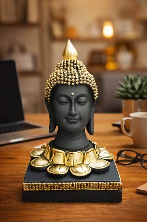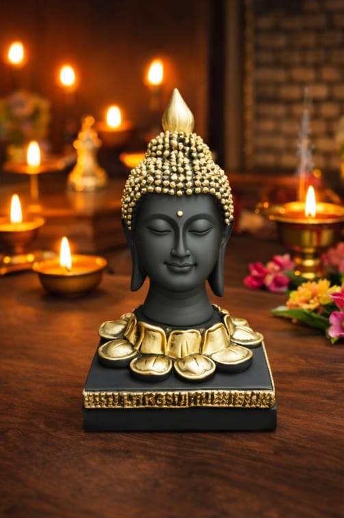 This beautiful black Buddha idol with golden accents is a perfect home décor showpiece. It represents peace, positivity, and mindfulness. Ideal for living rooms, offices, and meditation areas, this spiritual statue enhances the aesthetic and calming environment.