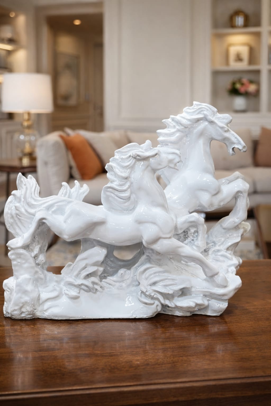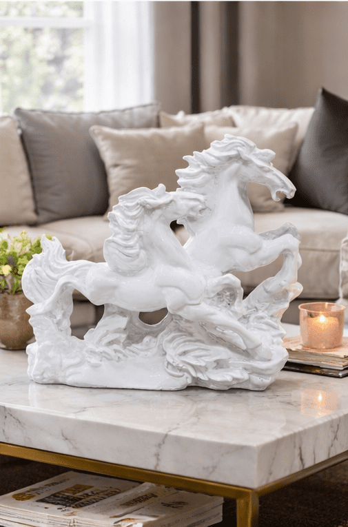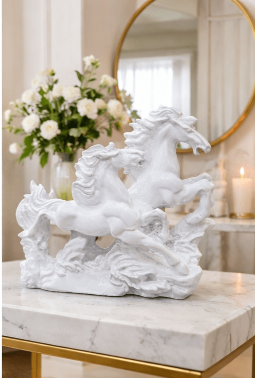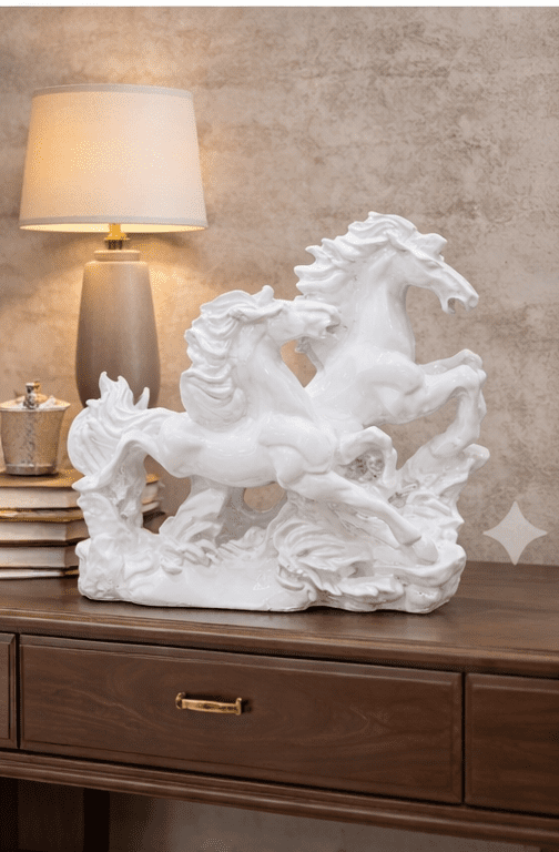 Enhance your home with timeless elegance and positive energy with this beautifully crafted white running horse showpiece, designed to bring both style and symbolism into your living space. This premium decor item showcases gracefully running horses that represent speed, strength, success, and continuous progress. The dynamic movement of the horses reflects ambition and determination, making this white running horse showpiece a perfect addition to modern homes and professional spaces.